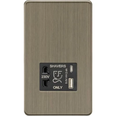 230VAC 20VA IP41 Single Voltage Shaver Socket Screwless low profile design with built in gasket Built in dual USB charger with Type-A and Type-C connections (5V DC 2.4A) (shared)