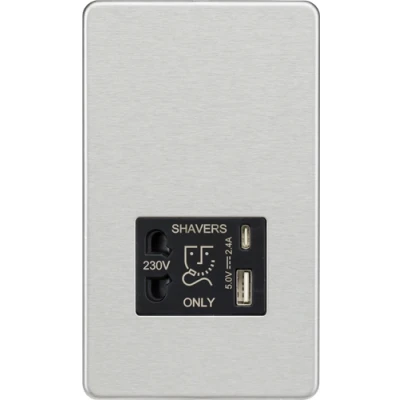 KnightsBridge Shaver socket with dual USB A+C (5V DC 2.4A shared) brushed chrome black insert
