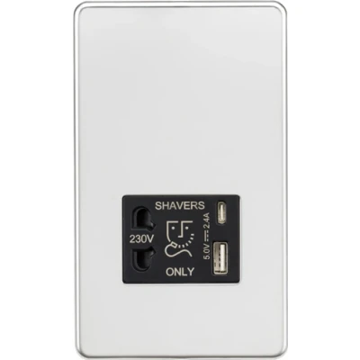 KnightsBridge Shaver socket with dual USB A+C (5V DC 2.4A shared) polished chrome black insert