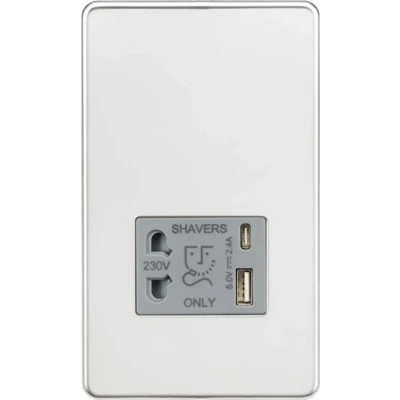 KnightsBridge Shaver socket with dual USB A+C (5V DC 2.4A shared) polished chrome grey insert