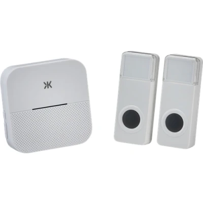 Wireless plug in mains powered door chime solution. Simply plug receiver in and mount the 2 bell pushes in desired locations i.e. front and back entrance - 58 ringtones - Volume control up to 110dB - Eye catching visual alert when doorbell can't be heard - Hassle free installation, no running any wires - Learning code prevents interference from other wireless transmitters - Working Frequency: 433Mhz - Working Temperature: -20 - 50° C 2 x Bell Push - IP55 rated - White with grey button - Door number sleeve - Can be screw mounted or with double sided sticker pads - Battery powered requires 1 x 12V 23A battery (included) - Power consumption: less than 10mW - Range of approx. 150-200m* Receiver - Indoor use only - 230V Plug in receiver - Power Consumption: less than 0.3W - Range of approx. 150-200m* *Dependent on environmentTechnical Specification:Depth (mm): 26.2Dimensions: Height: 81mmWeight: 0.2KgWarranty: 1 Year