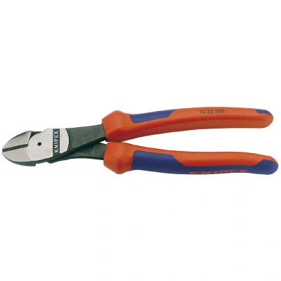 General description High leverage diagonal side cutters designed for professional use, featuring a 12° angled head for easier cutting of protruding wires. Manufactured from chrome vanadium electric steel, oil hardened and tempered for durability and strength. The cutter has a forged-on pivot instead of a traditional rivet, providing extra leverage during cutting. Heavy-duty molded handles with slip guards offer increased comfort and safety during use. Technical specifications Length: 200 mm Material: Chrome vanadium electric steel Hardness of cutting edges: 64 HRC Head angle: 12° Compatibility and accessories Suitable for cutting medium-hard wires and piano wire Installation No installation required; ready to use out of the box. Usage Use for cutting wires protruding from flat surfaces or in tight spaces where angled cutting is advantageous. Ensure proper grip and leverage for safe and effective cutting.