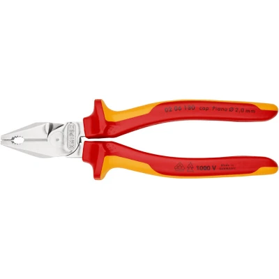 02 06 180 SB High Leverage Combination Pliers 35% less effort required than with conventional combination pliers. with cutting edges (hardness approx. 63 HRC) for heavy duty. Easier work due to optimised leverage. Easier cutting, powerful gripping, bending and pulling. Long cutting edges for thicker cables. With gripping zones for flat and round material, suitable for versatile use. Precise, minimal light gap between the gripping jaws to ensure optimal function of the cutting edges. Cutting edges additionally induction-hardened, cutting edge hardness approx. 63 HRC. - Cutting capacities hard wire (diameter): Ø 2.5mm- Cutting capacities piano wire (diameter): Ø 2.0mm- Cutting capacity copper cable, multiple-stranded: Ø 11.5mm- Cutting capacity copper cable, multiple-stranded: 16.0mm²- VDE tested: yes