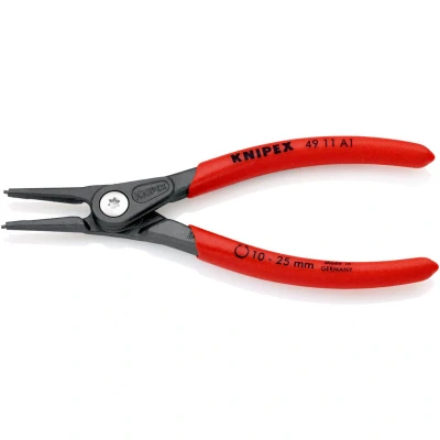 49 11 A1 SB Precision Circlip Pliers heavy duty in continuous operation: up to 10 times longer service life compared to turned tips. With inserted tips for reliable work. with overexpansion guard. Large contact faces on the tips: no distortion of circlips, easy fitting. Bolted joint: precise, zero backlash operation of pliers. Internal opening spring, protected and captive. Non-slip plastic coating on the handles. Slim head style allows use in confined areas. DIN 5254 A; straight jaws. - Size of shaft: Ø 10 – 25mm- Tips (diameter): 1.3mm