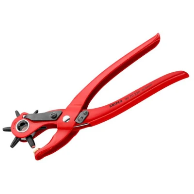 90 70 220 SB Revolving Punch Pliers To punch holes into leather, textiles and plastic material. With six interchangeable punches: Ø 2.0 / 2.5 / 3.0 / 3.5 / 4.0 / 5.0 mm. With opening spring and locking device. Powder-coated for reliable protection against rust.