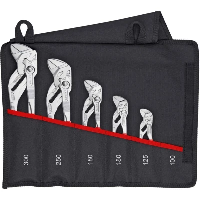 00 19 55 S4 Set of Pliers Wrenches Pliers wrenches from KNIPEX are ideally suited for the gentle gripping, holding, pressing and bending of workpieces. Each one replacing an entire set of wrenches. High-quality tool roll made from durable polyester fabric with hook-and-loop fastener. equipped with pliers wrenches in five different lengths from 125 to 300 mm. Content: 1 x 86 03 125 KNIPEX Mini pliers wrench pliers and a wrench in a single tool (125 mm), 1 x 86 03 150 KNIPEX Pliers Wrench pliers and a wrench in a single tool (150 mm), 1 x 86 03 180 KNIPEX Pliers Wrench pliers and a wrench in a single tool (180 mm), 1 x 86 03 250 KNIPEX Pliers Wrench pliers and a wrench in a single tool (250 mm), 1 x 86 03 300 KNIPEX Pliers Wrench pliers and a wrench in a single tool (300 mm),