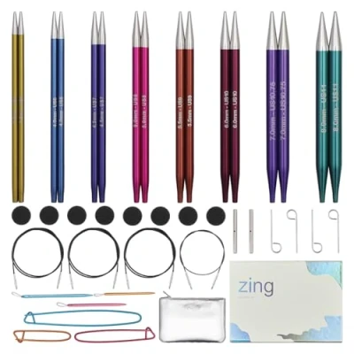 GIFT SET: The KnitPro Zing Melodies of Life Interchangeable Needle Set is a stunning gift for yourself or a knitting enthusiast. Packaged in a sleek box, it includes a complete set with interchangeable needle tips, cables, and various accessories ALUMINUM NEEDLE TIPS: The interchangeable knitting tips are crafted from high-quality, lightweight aluminum, shining in beautiful metallic shades. Each needle size is color-coded and clearly lasered onto the tip for easy identification COMFORTABLE AND PRECISE: The needles are designed for comfort with narrow, tapered silver-colored tips and a smooth surface that allows yarn to glide effortlessly DURABLE AND FLEXIBLE CABLE: The strong stainless steel cable with nylon coating is both sturdy and flexible, allowing it won't kink or twist during knitting COMPREHENSIVE ACCESSORIES: The set includes cable connectors to extend cables, tapestry needles, stitch holders, and cable wrenches