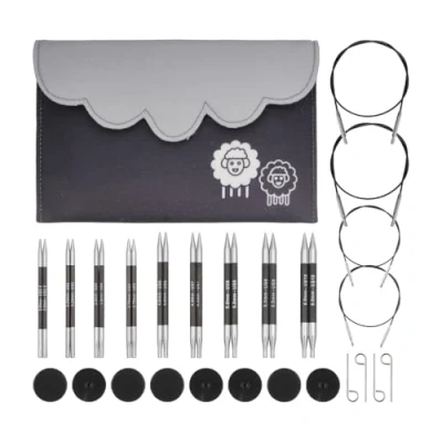 Deluxe Set: The Deluxe Set has 9 pairs of interchangeable knitting needles with 2 cables each 16" (40cm) and 20" (50cm) in length. There are 8 end caps and 4 cable keys as knitting accessories. It is a complete package of all the necessary items for knitting in the round. Lightweight & Super Strong Material: KnitPro Karbonz Needle, made of carbon fibre showcases exceptional strength and rigidity of carbon fibres. The lightweight nature of the carbon fibre makes it feel weightless and easy on your hands while knitting. 360° Swivel Stainless Steel Cables: A unique blend of flexibility and convenience the stainless-steel cables in this set with 360° Swivel mechanism makes sure the hands and the needle move effortlessly and provides a smooth, kink-free knitting experience. Smooth Joins: The smooth joins at the end of the knitting needle allows the knitter to connect the needle to the cable with ease. The seamless cable connectivity allows the swivel cable to swing freely, as they join with precision and are perfectly compatible with other needles and cables in the set. Practical and User-Friendly Packaging: This interchangeable knitting needle set comes in a zippered fabric case for easy storage and organization. The compact case with elastic loops helps you neatly tuck the needles in place and keeps them organized in the most easy and functional way.