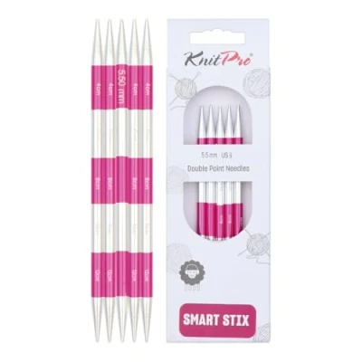 Double-Pointed Needles: Made from fine-grade aluminum, KnitPro Smartstix double-pointed needles are lightweight and built for longer knitting sessions. Perfectly crafted metal tips move effortlessly through the yarn, giving your knitted piece a beautiful stitch definition. Available Needle Sizes: KnitPro Smartstix Double-pointed needles are color coded and available in 16 popular sizes, ranging from 2mm to 8mm, perfect for knitting circular items like socks, gloves, and mittens with small circumferences. 2-in-1 Knitting Tool: Smartstix is a perfect tool for smart knitters, who prefer precise knitting with accurate measurements. Each Smartstix needle is laser marked with a 2cm gap that lets you measure the gauge as you knit. It helps you make precise and clean stitches with ease. Laser-Printed Sizes: Each pair of vibrant Smartstix knitting needles has laser-printed markings that set them apart from other metal knitting needles. These precise markings do not rub off due to friction of the yarn or the hands of the knitter. Sustainable Paper Packaging: Packaged in FSC-certified recycled paper, these needles prioritize sustainability with responsibly sourced, plastic-free materials to help protect the environment.