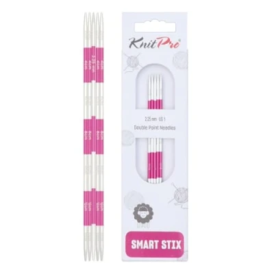 Double-Pointed Needles: Made from fine-grade aluminum, KnitPro Smartstix double-pointed needles are lightweight and built for longer knitting sessions. Perfectly crafted metal tips move effortlessly through the yarn, giving your knitted piece a beautiful stitch definition. Available Needle Sizes: KnitPro Smartstix Double-pointed needles are color coded and available in 16 popular sizes, ranging from 2mm to 8mm, perfect for knitting circular items like socks, gloves, and mittens with small circumferences. 2-in-1 Knitting Tool: Smartstix is a perfect tool for smart knitters, who prefer precise knitting with accurate measurements. Each Smartstix needle is laser marked with a 2cm gap that lets you measure the gauge as you knit. It helps you make precise and clean stitches with ease. Laser-Printed Sizes: Each pair of vibrant Smartstix knitting needles has laser-printed markings that set them apart from other metal knitting needles. These precise markings do not rub off due to friction of the yarn or the hands of the knitter. Sustainable Paper Packaging: Packaged in FSC-certified recycled paper, these needles prioritize sustainability with responsibly sourced, plastic-free materials to help protect the environment.