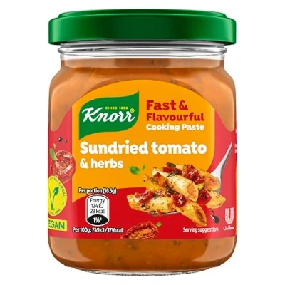 Knorr Sundried Tomato & Herbs Cooking Paste is perfect for adding intensely concentrated flavour to your dishes – just one teaspoon is enough to create a delicious meal! This tomato paste blends sundried tomatoes and Mediterranean herbs with balsamic vinegar for a rich and tangy flavour – just one teaspoon brings your dish to life The pack contains 8x 165 g jars of cooking paste, which can be stored in the fridge for up to 12 weeks With a delicious vegan recipe, this seasoning paste makes for a great condiment for dinners with friends or family Fast and flavourful, this seasoning is perfect for stirring into a pasta or cooking sauce, as a marinade for meat or veggies, or as a delicious alternative to pesto — all with just one teaspoon Loving this seasoning? Explore the full Knorr range featuring delicious stock pots and cubes