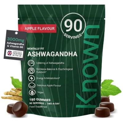3000MG ASHWAGANDHA - Ashwagandha Gummies by Known Nutrition contain the equivelant of 3000mg Ashwagandha with added Vitamin B6. Ashwagandha is a natural, plant-based Vegan Food Supplement that comes from the root of the Ashwagndha plant. WITH ADDED VITAMIN B6 - Vitamin B6 contributes to the regulation of hormonal activity, the reduction of tiredness and fatigue, and normal psychological function (EFSA). SUPPORT IMMUNITY & METABOLISM - Vitamin B6 also contributes to the normal function of the immune system, normal energy-yielding metabolism and normal functioning of the nervous system (EFSA). DELICIOUS & VEGAN FRIENDLY: Unlike other Ashwagandha supplements, Known’s Ashwagandha Gummies are a delicious alternative to bulky and hard-to-swallow tablets and capsules, or strange-tasting powders. Known’s Ashwagandha Gummies are free from artificial colours and flavours, preservatives, GMO, gluten and lactose. Just great-tasting Apple flavour gummies. With just 1.5–2g of sugar on average per gummy (around the same as 6 raisins), Known Gummies deliver essential nutrients without compromise. KNOWN TO BE MORE - Manufactured to the highest standards. BRC accredited.