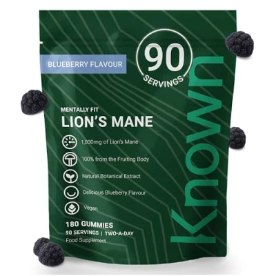 Known Delicious Lion's Mane Gummies 1000mg Mushroom Natural Blueberry Flavour 180 Vegan Gummies, 3 Month Supply