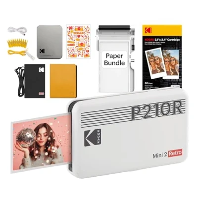 LOW PHOTO COST - Why pay more to print? Our KODAK Mini 2 Retro photo printer is the most affordable option to print right from your home. Photos are more affordable if purchased as a printer bundle. SUPERIOR PHOTO QUALITY - KODAK Mini 2 Retro uses 4Pass Technology to print flawless photos instantly. Each photo is printed in layers of ribbon with a laminating process so it’s fingerprint proof and water-resistant for long-lasting quality. TWO PHOTO TYPES - The KODAK Mini 2 Retro photo printer supports both border and borderless type photos. Write down your memories in the border type so they last forever. Print the borderless type to have larger sized photos. AR APP - Download the KODAK Photo Printer application to print anywhere and anytime. You can use the fun augmented reality features and other decorative functions like beauty, filters, frames, and more. COMPACT SIZE - KODAK Mini 2 Retro polaroid photo printer fits right in your hands and your bag to conveniently print. This portable photo printer is all you need to create unforgettable memories with your loved ones.