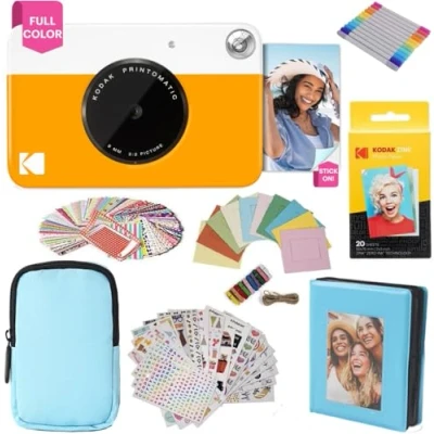 KODAK Printomatic Full Color Instant Print Camera Gift Bundle + Soft Case Zink 2x3" Sticky Back Photo Paper 20pk Album Sticker Sets Frames Markers Hanging Frames, Fun Yellow