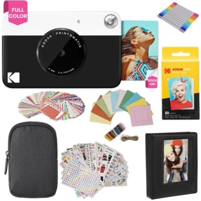 KODAK Printomatic Instant Camera (Black) Gift Bundle + Zink Paper (20 Sheets) Case 7 Sticker Sets Markers Photo Album