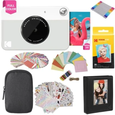 KODAK Printomatic Instant Camera (Grey) Gift Bundle + Zink Paper (20 Sheets) Case 7 Sticker Sets Markers Photo Album