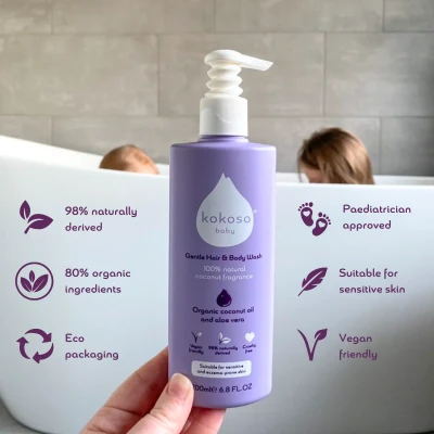 Kokoso BabyOur Gentle Hair & Body Wash (200ml) contains moisturising organic coconut oil blended with soothing organic aloe vera and coconut-based bubbles. The soft creamy formula of Kokoso baby wash is a handy 3-in-1, gently cleansing skin, soothing the scalp and nourishing hair from root to tip. It scooped Silver in the ‘Free From’ Skincare Awards, so you can be confident it’s free from nasties and kind to sensitive skin.. Now available in eco-friendly 500ml Refills so you can reuse your 200ml bottle - hooray! Features:. Named 'best affordable baby shampoo for irritant-free hair and skin' by The Evening Standard. Voted 'Best Body Wash' in the Made For Mums Toilet & Bathtime Awards. Ultra-mild, vegan-friendly and pH balanced. 80% organic. 98% naturally derived. Loaded with beneficial plant-based ingredients. Dermatologically tested & paediatrician approved. Safe from birth. Suitable for sensitive & eczema-prone skin. 100% post-consumer recycled and fully recyclable bottles. The bottle is now reusable too thanks to our NEW refills. New generation recyclable pumps. For every bottle of wash purchased we'll rescue two bottles of plastic pollution from the ocean. Available in Unfragranced and Natural Coconut. We recommend our unfragranced products for younger babies.. Our scrummy coconut scent, created exclusively in Switzerland, is 100% natural and free from the 26 allergens listed in European Regulations. Making it safe for even the most sensitive of skin.