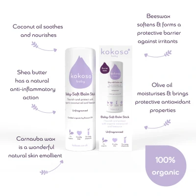 Kokoso BabyOur Baby-Soft Balm Stick (13g) provides natural moisture and protection for your family’s skin in our super handy stick applicator. Made with 100% natural and organic ingredients, the magical and multi-purpose Kokoso balm stick creates a protective barrier against the elements, nourishes dry skin and soothes irritation from colds, dribble or teething.. Features:. New & improved twist-up tube. Glides easily onto skin. Certified organic by Ecocert. Forms a shield on delicate faces against weather & environment. Protects dribbly chins. Can be used as a nappy balm (use one stick exclusively for this purpose!). Great for dry skin and hands, sore lips, runny noses and chapped cheeks. Keep it in your bag for bumps and bruises. Dermatologically tested and Paediatrician approved. Suitable for sensitive and eczema-prone skin. Easy application – no mess, no fuss. Named 'Best Multitasker for Mummy's Handbag' by Beauty Shortlist. For every balm stick purchased we rescue 0.75 bottles of plastic pollution from the ocean. Available in Unfragranced and Organic Lavender. We recommend our unfragranced products for younger babies and very sensitive skin.. Related Blogs:. How To Use Our Baby Balm Stick