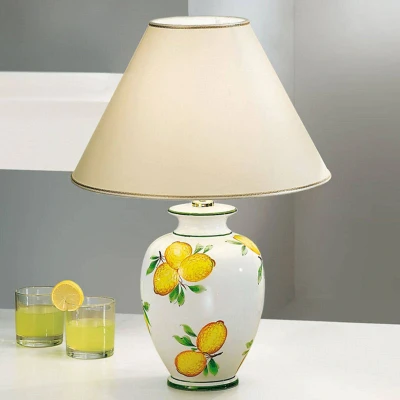 Table lamp Giardino Lemone with lemon motif creates Mediterranean flair The table lamp Giardino Lemone captivates with its classic design. The bulbous lamp base made of ceramic is decorated with a hand-painted lemon motif in bright yellow, creating a sunny Mediterranean flair. The beige textile shade in cone shape with golden trim complements the design of the lamp base perfectly. Especially as additional lighting on a dresser or windowsill Giardino Lemone is very well suited.