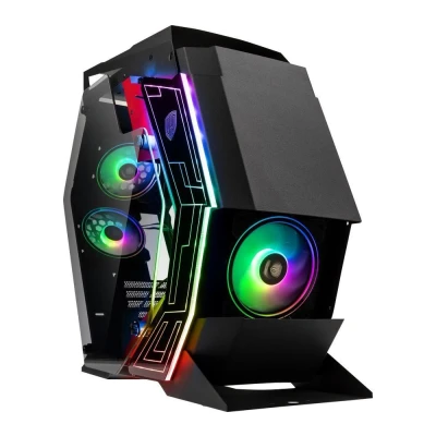 The Chungus Hench's futuristic looks are sure to be a talking point. Is it a time machine? An alien invader? Nope, it's one mid-tower ATX case, one giant leap for your gaming. No matter how hard you push your PC, the pre-installed cooling will keep it firing full speed ahead. The raised front, top and side panels all help airflow and that means the 4 fans can work even more efficiently to keep performance at warp speed. And they're RGB-lit so you can really rock that neon cyber-punk look.Good to know- The steel frame is super hardy and there's tempered glass for you to admire all your fancy components- PWM fans are whisper-quiet under light loads so they won't bother you or your flat mates- It's spacious enough for you to spec a powerhouse - ATX motherboards, 310 mm GPUs, even water cooling- Speed and storage are well catered for - room for 3 hard drives and options to mix SSDs and HDDs - You're sorted for peripherals with 2 USB ports and a mic jack