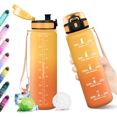 Sports Water Bottle: The sports water bottle is made of high quality food grade plastic, safe and non-toxic, free of BPA and other harmful substances. You can enjoy the water with peace of mind, away from harmful chemical compounds! Reusable bottle is a viable alternative to disposable plastic bottles. Water bottle with time markers: Maintaining good hydration is key to staying energetic. This bottle features timetable and motivational phrases to help you scientifically manage your water intake and encourage you to drink more. The motivational water bottle is perfect for taking to the office, school, gym or outdoor hiking. Easy to carry: The ergonomic design of the sports bottle makes it shockproof and shatterproof. It is equipped with a sturdy wrist strap for comfortable grip. The snap cap and silicone seal ensure a 360° leak free seal. You can safely store the gym bottle in your backpack. Opening with a single botón: La garrafa agua está equipada con una tapa abatible que se abre con una solo toque, fácil de usar with one hand. La tapa de boquilla directa y el filtro de frutas permiten añadir hielo, frutas o té para darle más sabor a tus bebidas. Las botellas de agua son ideales para el día a día, el deporte, la clase o las actividades al aire libre. VIBRANT COLORS FOR EVERY LIFESTYLE: Our water bottle comes in a variety of colors and three different capacities, so you can find the ideal size for you. This elegant bottle is a perfect gift for friends and family on special occasions.