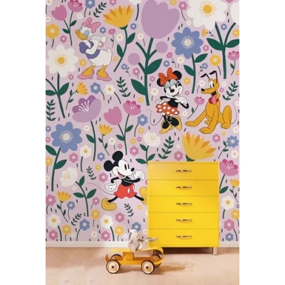 Mickey, Minnie and Pluto enjoy a fabulous flower meadow and enjoy the splendour of colours of nature. If you look closer, you will also recognise Daisy Duck, the wayward but lovable duck that blends perfectly into the colour scheme. The bright colours of the Disney wallpaper add a refreshing touch to any child's room and add extravagance. German quality fleece (155 g/m²). Retains its shape, durable, odour-free, smooth and environmentally friendly. FSC certified product. Professional graphic designers guarantee a first-class visual experience. From design to print! 100% designed and made in Germany. Brilliant, fade-resistant, waterproof and odourless colours. All our materials are solvent-free, phthalate-free and harmless in the interior. Suitable for children's rooms and bedrooms. Apply paste to the wall to be wallpapered and attach the precisely fitting strips to the wall., Manufacturer: Komar