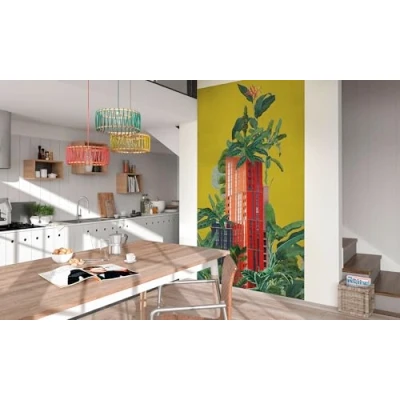 The bright red of the high-rise building forms an impressive contrast to the rich green tones of the surrounding vegetation. The yellow background enhances the vibrant and inviting flair of this scene and creates a unique backdrop that brings a piece of nature and urbanity to the home. German quality fleece (155 g/m²). Retains its shape, durable, odour-free, smooth and environmentally friendly. FSC certified product. Panel width: 50 cm. Our professional photographers and designers ensure a high level visual experience. From design to print, made in Germany. Brilliant, fade-resistant, waterproof and odourless colours. All our materials are solvent-free, phthalate-free and harmless in the interior. Suitable for children's rooms and bedrooms. Includes assembly instructions (English language not guaranteed). Apply paste to the wall to be wallpapered and attach the precisely fitting strips to the wall. No bubbles or wrinkles., Weight: 1.4109584768 pounds, Manufacturer: Komar