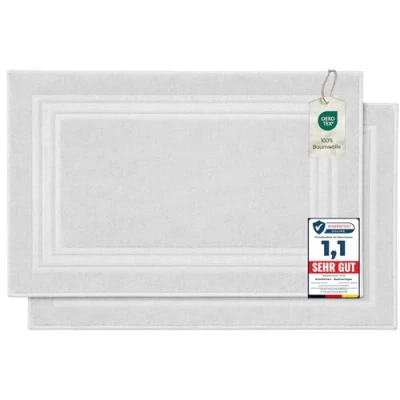 Box contents: pack of 2 bath mat set 50 x 70 cm. Colour: white The bath mat set offers the best feel-good comfort thanks to its special kind. Skin-friendly and fluffy, absorbent and extremely durable. High-quality bath mat made from 100% cotton. Made from 100% soft, tear-resistant cotton in 600 g/m². Tested quality: the bath mat is tested for harmful substances according to Oeko-Tex Standard 100. Wash at 40°C. Iron at medium temperature. Do not use bleach. Tumble dryer-safe. Can be tumble dried on a low temperature.
