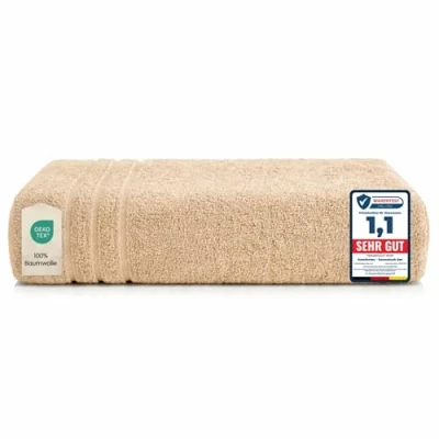 Box contents: 1 bath towel 100 x 200 cm. Colour: beige The Komfortec size towel offers the best feel-good comfort thanks to its special kind. Skin-friendly and fluffy, absorbent and durable. High-quality Komfortec bath towels made from 100% cotton with two woven borders. Ideal for sauna, spa, sports or wellness holidays. Tested quality: this product is tested for harmful substances according to Oeko-Tex Standard 100. Wash at 40°C. Iron at medium temperature. Do not use bleach. Can be tumble dried. Can be tumble dried on low heat.