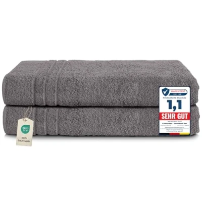 Scope of delivery: 2 pieces of bath sheets 80x200 cm. Color: Grey Komfortec bath sheets offers the best feel-good comfort thanks to its special nature. Skin-friendly and fluffy, absorbent and extremely durable. High-quality extra-large bath sheets made from 100% cotton with two woven borders. Ideal for sauna, spa, sports or wellness holidays. Tested quality: This is a product that has been tested for harmful substances in accordance with Oeko-Tex Standard 100. Wash at 40°C. Iron at low temperature. Do not use bleach. Can be tumble dried at low temperature.