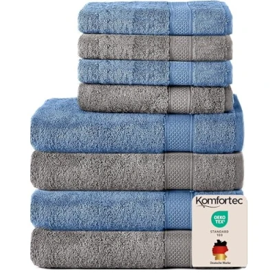 Box contents: 4 hand towels 50 x 100 cm and 4 bath towels 70 x 140 cm. Total 8-piece towel set. Colour: anthracite grey/light blue The shower towel and bath towel set offers the best feel-good comfort thanks to its special kind. Skin-friendly and fluffy, absorbent and extremely durable. High-quality towel set made from 100% cotton with two woven borders. Komfortec terry towels set are very absorbent with a high cotton density of 470 g/m². Tested quality: Komfortec set of 8 terry towels are tested for harmful substances according to Oeko-Tex Standard 100. Wash at 40°C. Iron at medium temperature. Do not use bleach. Tumble dry on low heat.