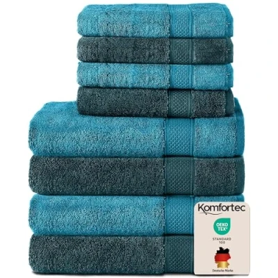 Komfortec Set of 8 Hand Towels 100% Cotton, 4 Bath 70 x 140 cm and 50 100 cm, Terry Clothing, Soft, Large, Turquoise/Petrol