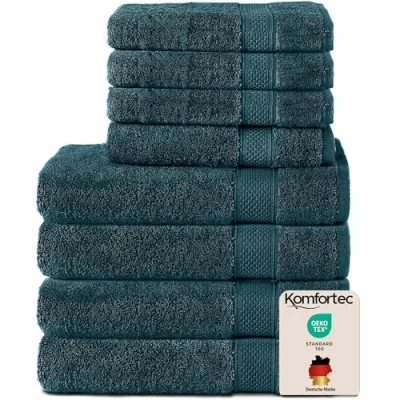 Komfortec Set of 8 Hand Towels 100% Cotton, 4 Bath 70 x 140 cm and 50 100 cm, Terry Towelling, Soft, Towel, Large, Petrol Blue