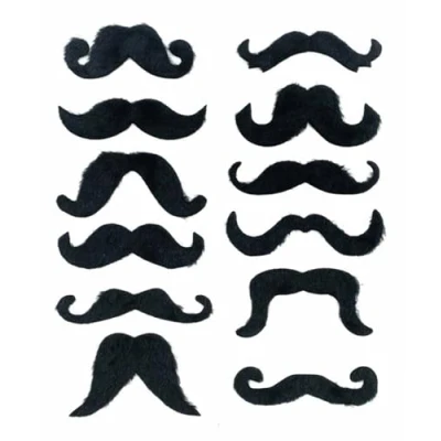 Pack of 24 Black Moustaches: The varied styles add a hint of mystery and intrigue to your look, perfect for adding a fun touch to your appearance. Range of moustaches in different shapes and sizes, measuring approximately 10cm across. Easy to Attach: With its adhesive backing, this mustache is a breeze to attach, staying securely in place throughout the night without any hassle. Easily transform into various characters with unique moustache styles. The Smarty is sleek and sophisticated, The Rogue is daring and mischievous, The Scoundrel is charismatic, The Casanova is smooth and suave, The Partyboy is lively, and The Bandit is bold and striking. Perfect for any occasion! Comfortable to Wear: Lightweight and comfortable, you'll hardly notice you're wearing it, allowing you to enjoy your costume party or event without any discomfort. Suitable for All Ages: Whether you're an adult or a child, this pack of moustaches is suitable for everyone, making it great for family dress-up occasions., Manufacturer: Komonee