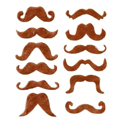 Pack of 12 Brown Moustaches: The varied styles add a hint of mystery and intrigue to your look, perfect for adding a fun touch to your appearance. Range of moustaches in different shapes and sizes, measuring approximately 10cm across. Easy to Attach: With its adhesive backing, this mustache is a breeze to attach, staying securely in place throughout the night without any hassle. Easily transform into various characters with unique moustache styles. The Smarty is sleek and sophisticated, The Rogue is daring and mischievous, The Scoundrel is charismatic, The Casanova is smooth and suave, The Partyboy is lively, and The Bandit is bold and striking. Perfect for any occasion! Comfortable to Wear: Lightweight and comfortable, you'll hardly notice you're wearing it, allowing you to enjoy your costume party or event without any discomfort. Suitable for All Ages: Whether you're an adult or a child, this pack of moustaches is suitable for everyone, making it great for family dress-up occasions., Manufacturer: Komonee