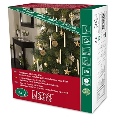 16 cm high, wireless LED Christmas tree candles - extension set with five lights These attractive, white 16 cm high LED candles spread a warm white LED light over the Christmas tree. They are very easy to place on the tree as they do not require a cable. They run on batteries. - Battery-powered Christmas item for indoor use - Batteries are included (10 x AAA)