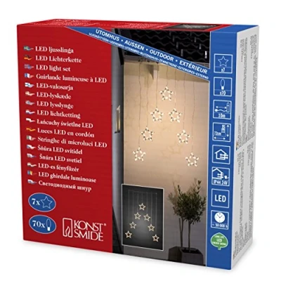 This LED light curtain for outdoor use is not only a sparkling highlight but also a real eye-catcher on house from afar This light curtain can be used in many ways. Whether on windows, doors, walls or roofs, the light curtain shines with its 70 warm white diodes With its 7 star silhouettes of 18 cm, this light curtain gives a beautiful effect