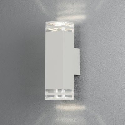 Konstsmide Handmade Outdoor Wall Light Mains Powered/Pollux Double Up Down Modern Lantern/2x7 Watt Max GU10 Lamp/Clear Acrylic Glass Lens/Aluminium/IP44/White Outside