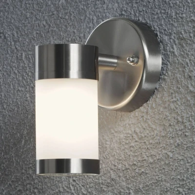 Outdoor wall lamp Modena in stainless steel with satined glass The luminaire is made of stainless steel and satinised glass. The frosted glass provides a pleasant illumination. With this exterior wall light you can set beautiful accents.