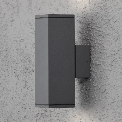 Outoor wall light Monza with two light openings The Monza outdoor wall light is a simple light with a geometric shape. It is made of aluminium and its surface is painted an anthracite colour. The overall modern appearance is enhanced by the two contrasting lights. When the light source is turned on, the light of the GU10 light bulbs used is directed upwards and downwards on the wall, uniquely illuminating the outside area. Suitable light bulbs are available as accessories.