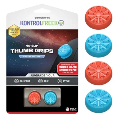 THE GALAXY, NOW WITH NO-SLIP GRIP – Experience the legendary Galaxy design combined with our most advanced no-slip technology. These Switch 2 thumb grips provide iconic looks and unmatched performance. ULTIMATE GRIP IN ANY SITUATION – Our proprietary no-slip rubber compound wicks away moisture, ensuring your thumbs stay firmly planted on the joystick caps, giving you flawless control during intense gaming sessions. THE FPS ADVANTAGE ON SWITCH – This mixed-height set includes a high-rise stick for precision aiming in games like Fortnite or Apex Legends, and a mid-rise stick for agile movement, giving you a true competitive edge. PERFECT FIT FOR YOUR SWITCH 2 – Securely locks onto both Nintendo Switch 2 Pro Controller and Joy-Con analog sticks. These controller grips are the perfect complement to the classic Red & Blue Joy-Con colors. GUARD YOUR JOY-CONS – An essential Switch 2 accessory that protects your original analog sticks from wear and tear. A smart investment to help prevent the dreaded "Joy-Con drift" and preserve your hardware. TRUSTED BY MILLIONS, BUILT FOR NINTENDO – Get the world-class performance of KontrolFreek, now optimized for your Nintendo Switch 2. Elevate your play in both handheld and docked mode.