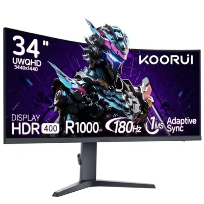 ULTRA WIDESCREEN MONITOR: The 34inch large monitor (3440*1440) fills your field of view, while the 1000R design brings a truly immersive experience that offers more realistic visuals and comfortable viewing. The 34 inch gaming monitor features a DCI-P3 90% wide colour gamut for accurate and lifelike colour gradation SMOOTHEST GAMING EXPERIENCE: Computer monitor ultrawide combines a refresh rate of 180 Hz with Adaptive Sync, images seamlessly and smoothly. The 'Dark Field Control' feature allows you to adjust the brightness of the display in low light conditions so that you can use game mode to view details in the dark EAGLE WING DESIGN: The 34 inch gaming monitor 's design is inspired by an eagle spreading its wings, with an abstracted eagle wing shape and stepped back design that exudes strength and movement. The ergonomically shaped stand enables the 180HZ Gaming Monitor to be tilted, swiveled, and adjusted in height MULTIPLE PORTS: KOORUI large screen for computer provide video interfaces via HDMI and DisplayPort ports. This 1440p monitor ultra wide is with 165Hz refresh rate and WQHD 2160*1440p resolution. You can connect the edge-less monitor to Xbox, PC and laptops etc CUSTOMIZABLE SETTINGS: Easily adjust brightness, contrast, and color settings to suit your preferences, ensuring a personalized viewing experience for both gaming and professional tasks