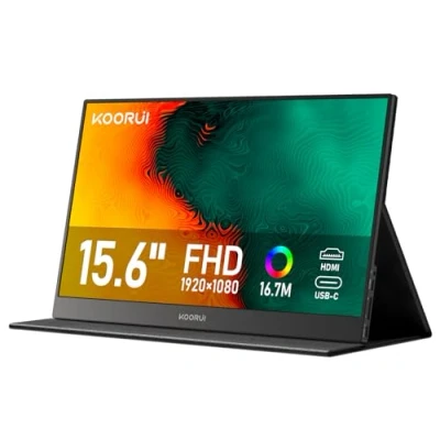 KOORUI E1511A Portable Monitor, 15.6 Inch 1920 x 1080 FHD IPS Second Screen with Built in Speakers for Laptop, PC, Mac, Xbox, PS5/4, USB Type C & HDMI, Smart Cover