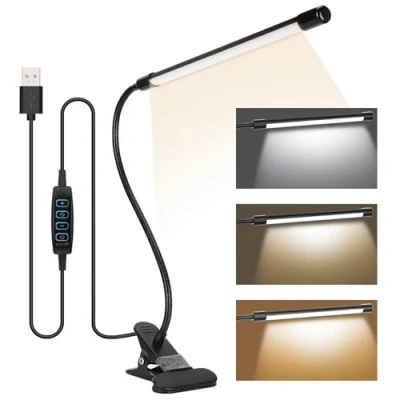 Desk Lamp Clip On Clamp Light & 3 Light Mode 10 Dimmable Brightness Eye Caring Book Adjustable for Reading Studying Working Video Conference Lighting 3 Color Temperature Modes & 10 Brightness Levels: Cool white, natural light, and warm white to meet your different needs. Whether for work, study, or leisure reading, you can find the right light. Stepless Dimming- Easily adjust the brightness through the touch switch, from low to high, as you wish. Flexible Clip Design: Strong clamping base can be easily fixed on desks, bedsides, bookshelves, and more. Equipped with anti-slip pads to ensure stability without damaging furniture surfaces. 360° Rotatable Lamp Head: Flexible arm can rotate 360 degrees freely, allowing you to adjust the lighting angle to precisely where you need it. Portable and Lightweight: This dimmable reading light lightweight design, Portable and Lightweight: This dimmable reading light lightweight design, easy to carry, providing comfortable lighting anytime, anywhere, whether at home, in the office, or on the go. What you'll get - 1x Reading Lamp with Clamp, 1x User Manual