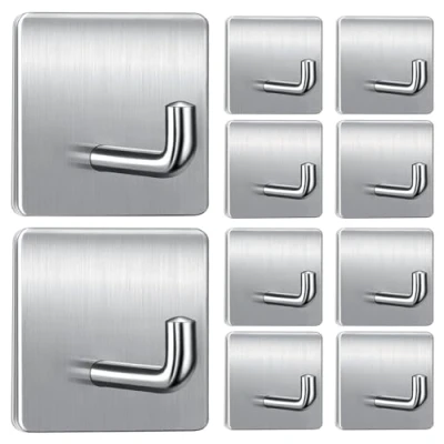 KOOSREEL Self Adhesive Hooks, Extra Sticky and Strong on Wall Door, 10 Packs 304 Stainless Steel Heavy Duty Hooks for Doors, Kitchen, Bathroom, Cupboards, Office, Walls, Coats, Keys, Silver