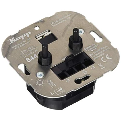 Double dimmer rotary off switch for dimmable LED lamps in the power range of at least 2 x 5 - max. 40 W and for incandescent and 230 V halogen lamps as well as for low-voltage halogen lamps with conventional transformer (phase control "RL") of at least 2 x 15 - max. 120 W/VA Only for mechanical transformers (magnetic), not suitable for electronic transformers - details of the transformer manufacturer must be observed. Base can be used with all frames and covers of Kopp switch ranges Rivo, Malta, Paris, Athenis and Milano Cover frame and central plate with dimmer button sold separately - not included Adjustable basic brightness, wave 4 mm with adapter to 6 mm/flattened. Infinitely adjustable allows individual dimming - the last set brightness level is saved., Manufacturer: Kopp