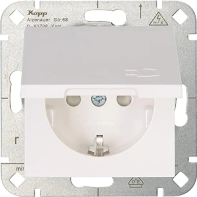 The HK 07 switch range from Kopp for professional use. An elegant design and the high-gloss surface in pure white blend seamlessly into almost all interior trends UP socket with increased touch protection Kopp brand, Manufacturer: Kopp