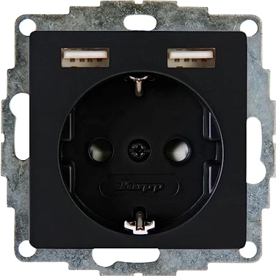 Kopp Athenis 296250082 Protective Contact Socket, 1 Way with 2 x USB Charging Sockets, 16 A, 250 V , Output Current of Sockets Max. 2400 mA/5 V, IP20, Black, Matte Surface