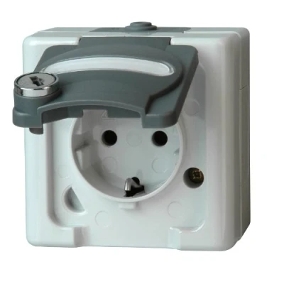 Blue Electric Power socket with safety lock-hinged lid Individual product combinations for vertical and horizontal arrangements are possible. The orientation of the individual products are easily and quickly produced by diagonally arranged screw slots. The basic body is designed such that a convenient option to perform wiring in all directions and to extend the application. The materials used are free of halogens and polyvinyl chloride and also resistant against many chemicals. Temperature fluctuations in the range of -20°C to + 110°C to prepare the products pose no problems Splash protection: Ingress Protection 44, Manufacturer: Kopp